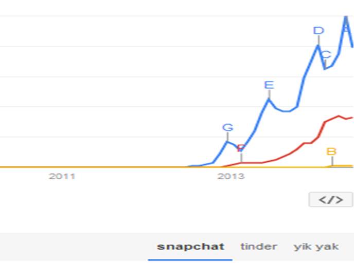 The favorite new social sites of my 2013-14 undergraduate students were Snapchat, Tinder and Yik Yak. According to a Google Trend chart at left, Yik Yak has not taken off but the other two have.