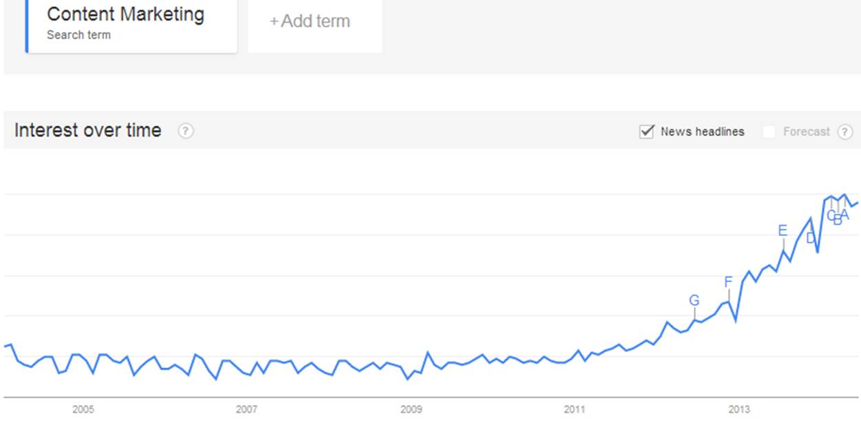Content marketing has been a hot topic in social media and marketing for the past few years. The Google Trends chart shows a dramatic upturn in searches for content marketing since 2011.
